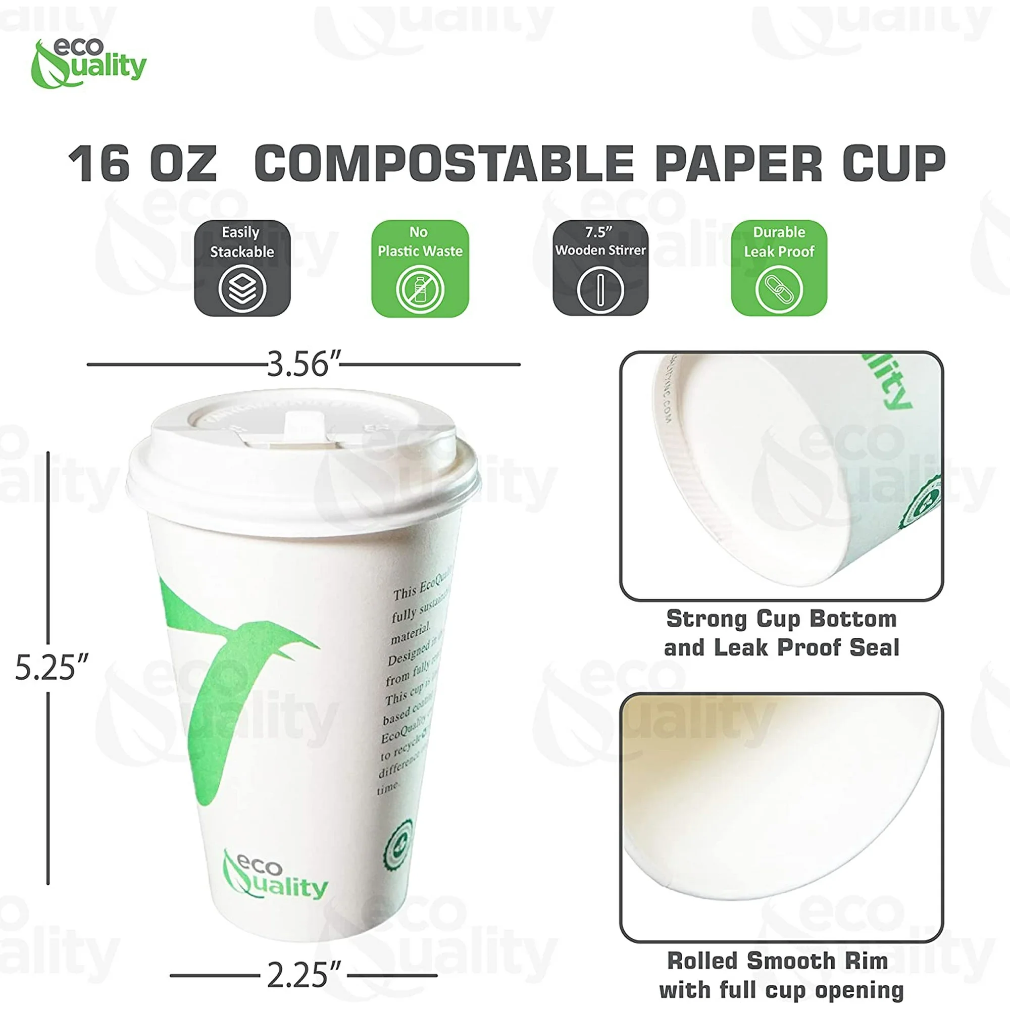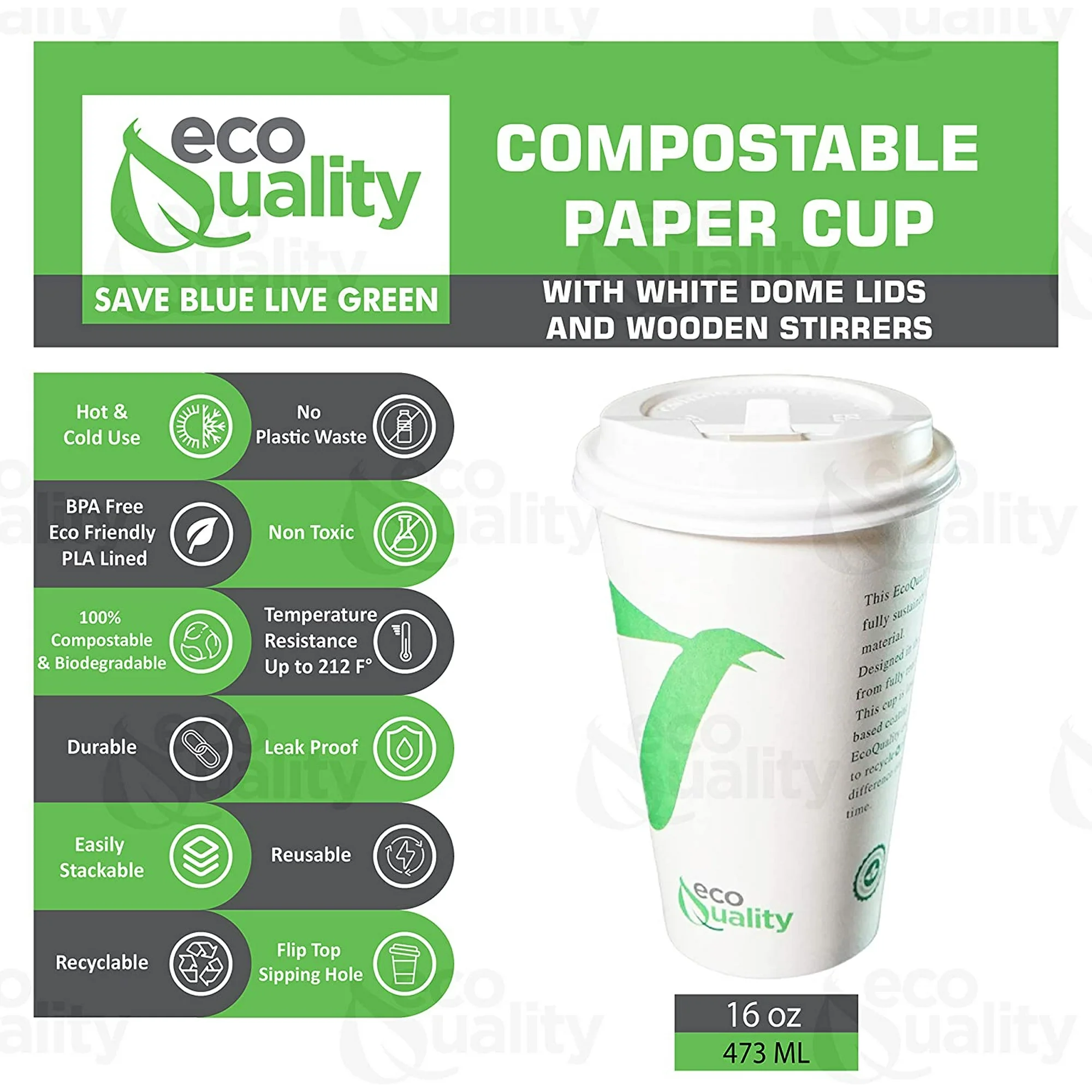 BIODEGRADABLE & COMPOSTABLE: Our hot paper tea cups are lined with a sustainable plant based starch. Which makes this cup a guilt free option, 100% natural and sustainable. Can be composted in a commercial facility. The perfect alternative to traditional plastic and wax lined paper cups. STRONG & LEAK FREE: Made from a premium and recycled paper our restaurant grade drinking cups can hold both hot and cold drinks for an extended amount of time without leakage. These EcoQuality disposable mugs are also microwave safe! CONVENIENCE: Our 16oz coffee cups with rolled rims are made for comfortable drinking. Can be used with any hot or cold drinks and make great for serving coffee, tea, espresso and hot chocolate. Disposable compostable cups can then be thrown directly into your compost bin after each use saving time and cleaning!