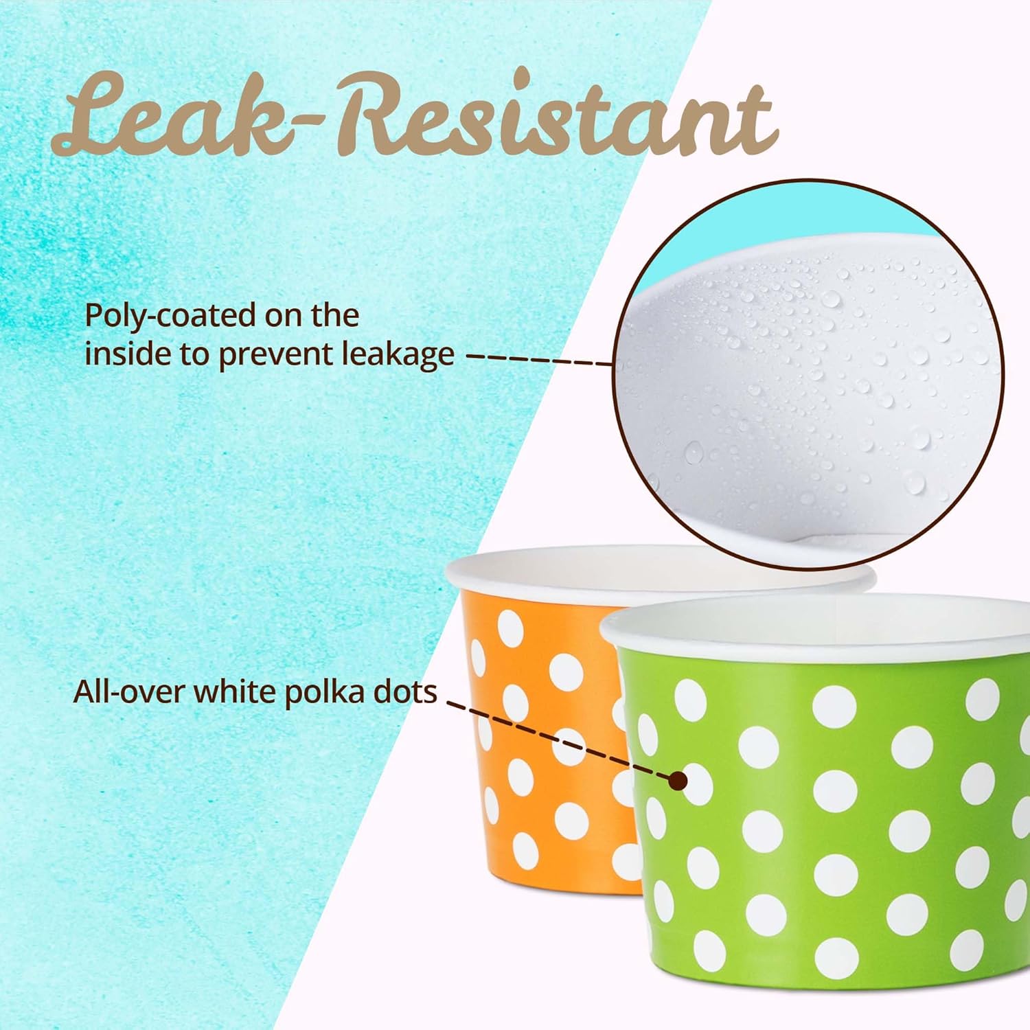 Leak-Resistant Construction: Cups are made of a sturdy paperboard with a polyethylene coating on the interior and exterior for outstanding leak resistance and to prevent condensation from weakening the paperboard. Serves Hot & Cold Food: In addition to holding ice-cream sundaes , froyo, gelato, and other frozen treats, these cups can also be used to serve hot items like chili, macaroni, and soup. 4 Oz Capacity: Holds a scoop of your favorite flavor with room to pile on toppings.
