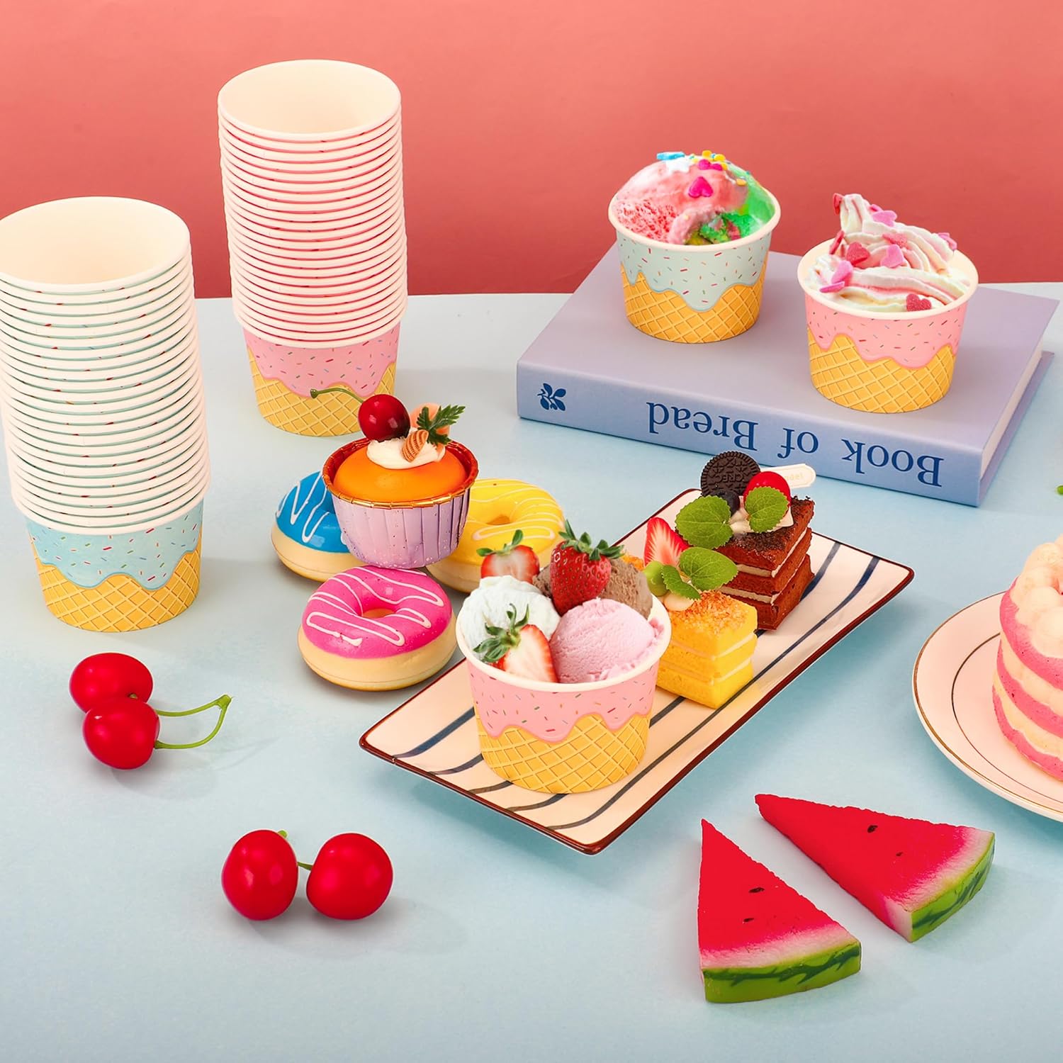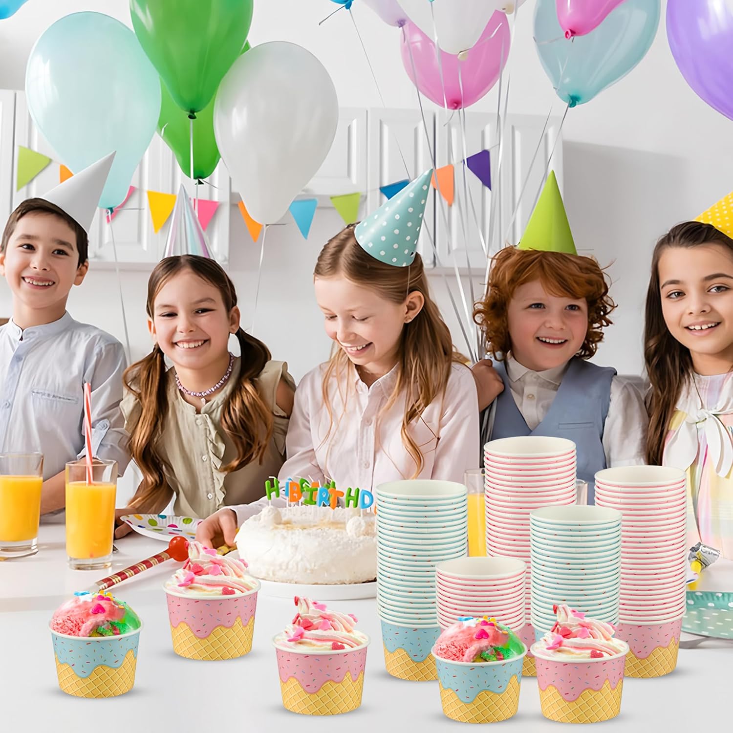 Elevate Your Dessert Presentation - Our stylish Disposable Dessert Bowls with their exuberant color palette not only enhance the visual appeal of your sweets but are also crafted for strength and durability, making them the ideal choice for both private delights and social gatherings Safe & Practical - Made from quality durable cardboard, our disposable ice cream bowls are designed for easy, hassle-free clean-up, saving time and water; serving your treats in our paper cups means you're making a responsible choice while offering your guests or family a joyful time Delight in Style & Convenience - Each Paper Ice Cream Bowl is 8 ounces in capacity, crafted from premium cardboard, featuring playful ice cream and waffle patterns in vivacious purples, pinks, greens, and blues to make your desserts look even more tempting; Greatly sized (3.5-inch/9 cm top diameter, 3-inch/7.5 cm bottom diameter, 2.4-inch/6.2 cm height) for any occasion Versatile Treat Solution - Our Paper Ice Cream Containers are the ideal partners for a range of your favorite delights from ice cream, frozen yogurt, soups, and cakes to cookies, popcorn, snacks, desserts, and condiments; they provide the flexibility and convenience you need whether at home or during a party feast